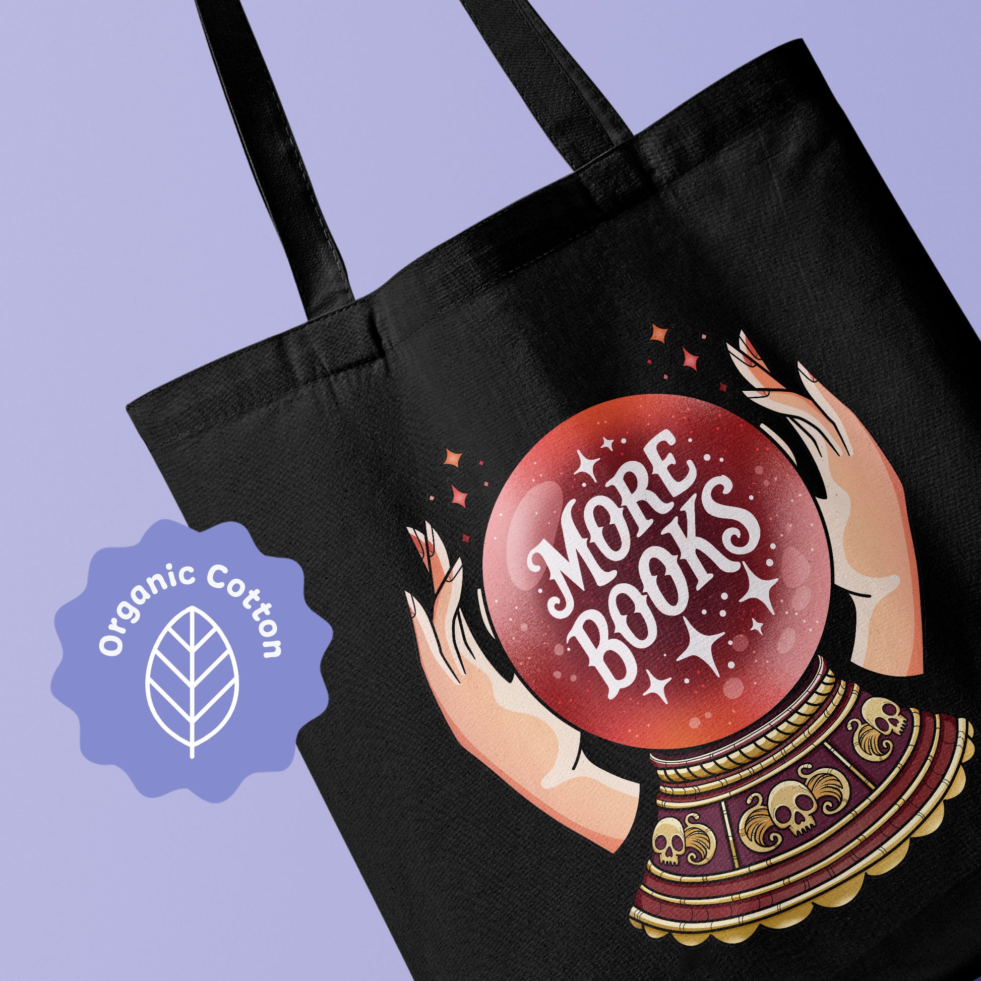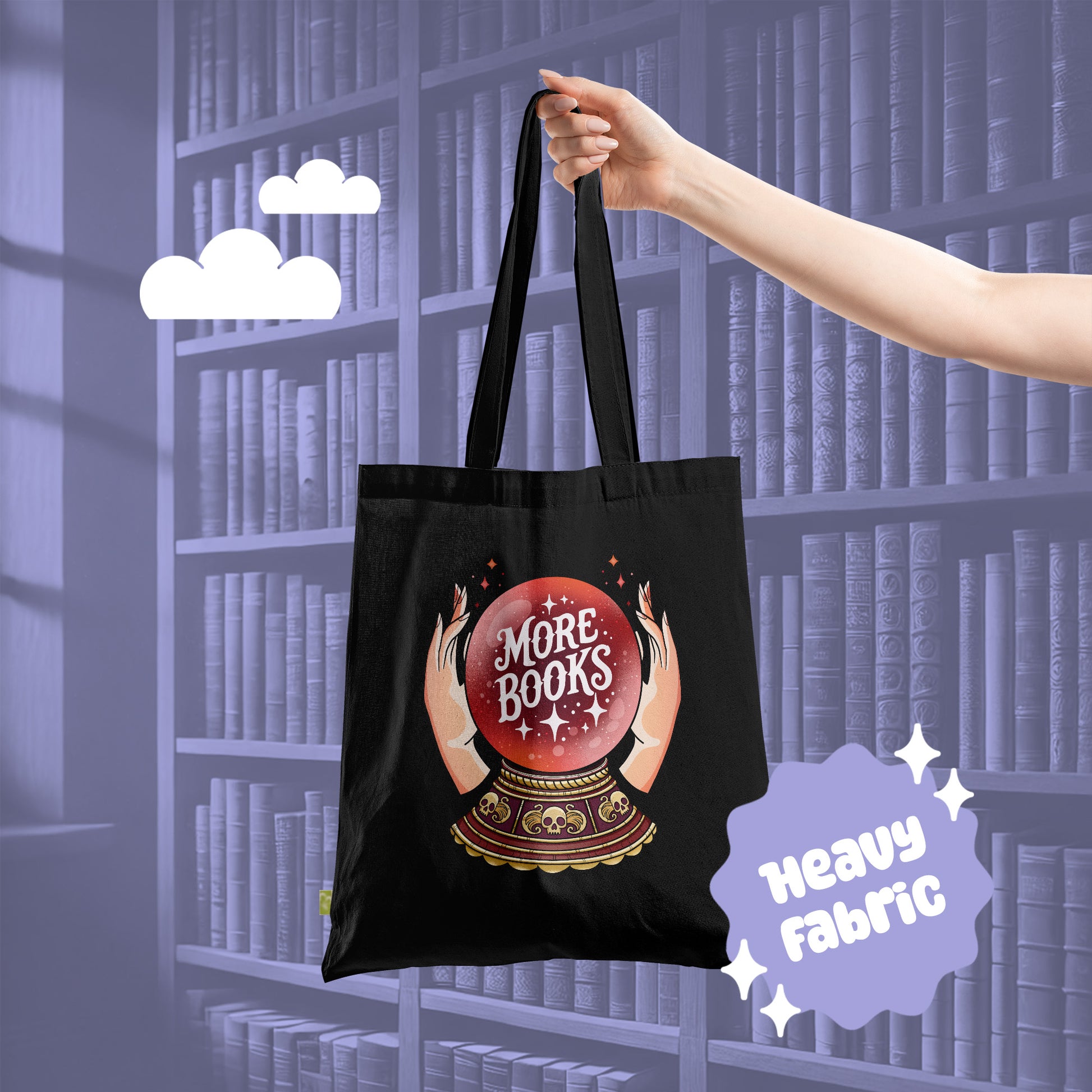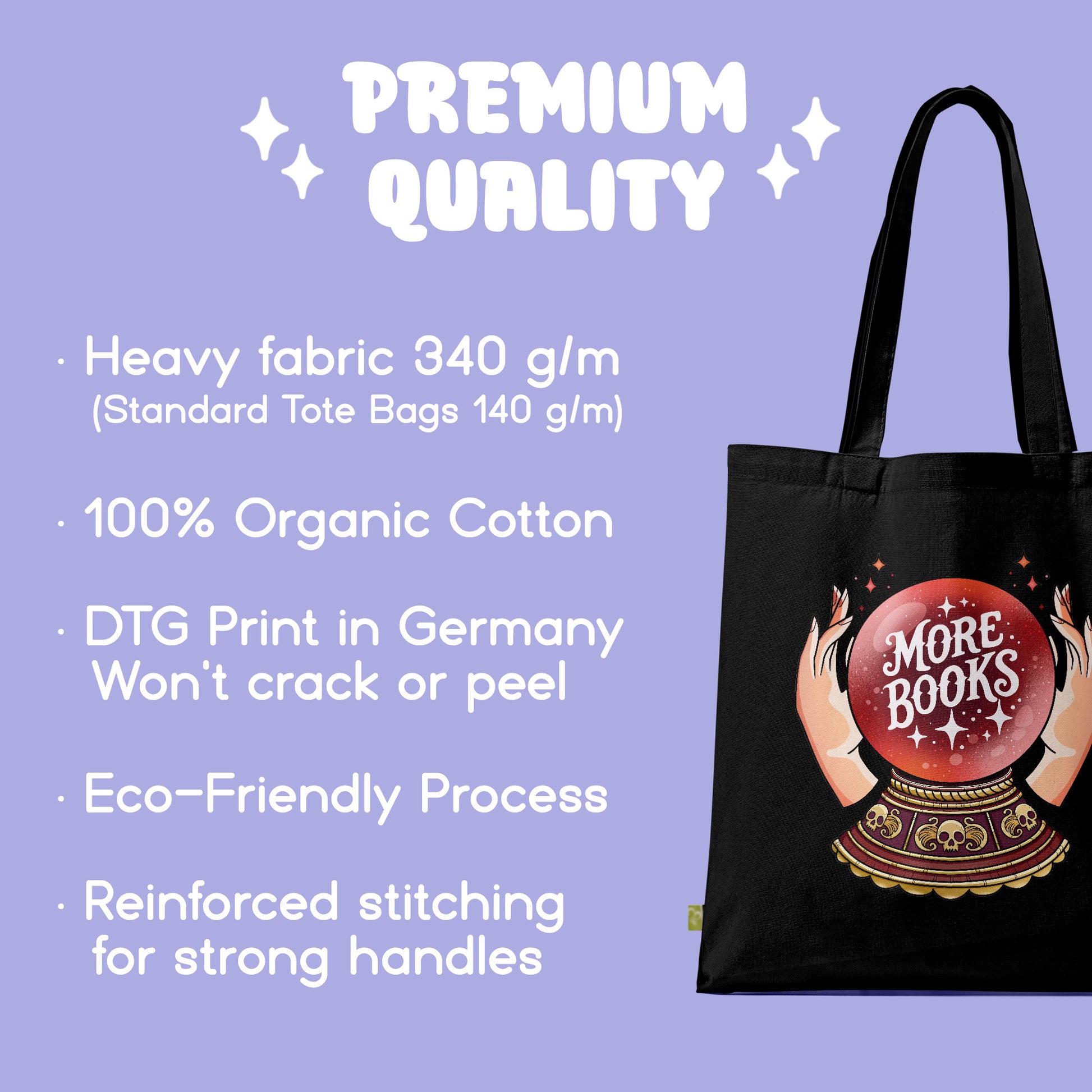 Der More Books Jutebeutel ist dein magischer Begleiter für mehr Lesespaß! Aus robustem, nachhaltigem Bio-Baumwoll-Canvas bietet er genug Platz für Bücher, Notizbücher und Laptops bis 15". Das verspielte Design mit Wahrsagerkugel zeigt: Deine Zukunft ist voller Geschichten. Perfekt für Leseratten, Hexen und alle, die Bücher lieben – stylisch, praktisch und umweltfreundlich!