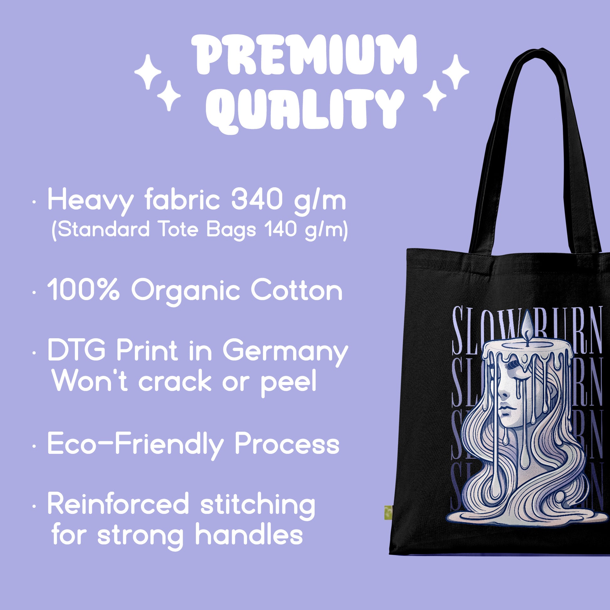Der Slowburn Tote Bag aus 100 % Bio-Baumwolle ist perfekt für alle Buchliebhaber! Mit viel Platz für Bücher und Laptops bis 15" begleitet er dich stylish durch Uni, Arbeit oder Alltag. Das minimalistische, handgezeichnete Kerzen-Design steht für die sanfte Leidenschaft einer Slowburn-Romanze. Robust, nachhaltig und lokal in Deutschland bedruckt – ein tolles Geschenk für alle, die Bücher lieben und dabei umweltbewusst bleiben wollen!
